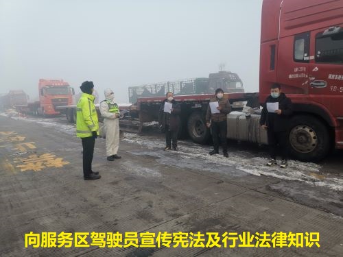 四是在辖区愉群翁服务区、拜什墩服务区及3个收费站在做好疫情防控的同时联合工作人员采取悬挂横幅、LED电子显示屏、张贴发放宣传单等形式,宣传了《中华人民共和国宪法》、《中华人民共和国民法典》、《公路安全保护条例》等法律法规,另外还对过往的的司乘人员及广大群众发放宣传单,宣传宪法精神及行业安全知识,扩大宣传面。并提醒广大司乘人员做好冬季行车期间的安全检查,防止因天寒结冰造成车辆追尾现象,同时做好暖心服务。