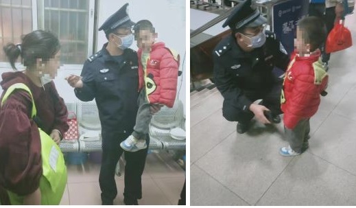 2023年2月2日,海口铁路公安处海安南站派出所民警在铁路轮渡北港码头开展巡逻时,发现一名迷路小男孩,民警迅速行动,帮助小孩找到妈妈。