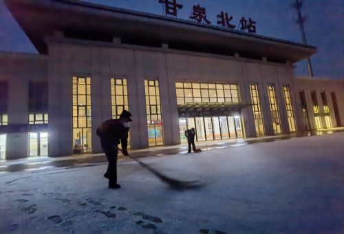 清晨六点,天还没亮,甘泉北站派出所的民警就已在车站广场列队集合开始了清除冰雪工作,大家相互配合、团结协作、干劲十足,争分夺秒在早晨第一趟列车到站前半小时,为群众疏通了一道温暖安心的“道路”。