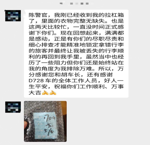该年轻男子姓汤,他告诉乘警,自己下车后发现拿错了行李后,内心也十分焦急但却不知如何处理。随即乘警陈警长通过与汤先生进行视频通话,仔细核对好行李箱内物品,经核对完好无损后,双方当事人也通过电话达成一致意见后,决定通过12306铁路服务平台交由车站转递。短短半小时内,惠铁乘警成功帮两位失主解决了燃眉之急,双方对乘警的工作表示由衷感谢。2月15日,当赖先生成功取回被错拿的行李箱后,再次向陈警长表达感谢之言。