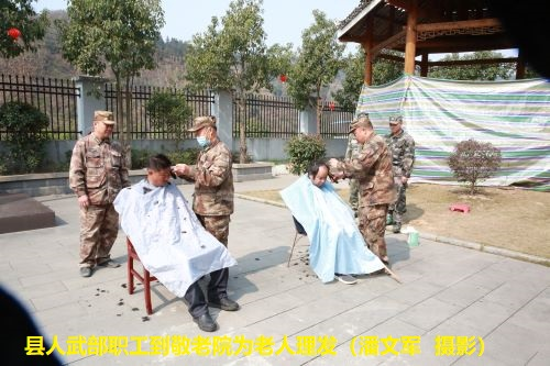 在丙妹镇中心敬老院,县人武部职工潘文军带领5名官兵开展送温暖活动,这也是县人武部今年第三次在丙妹镇中心敬老院开展志愿服务活动。大家分工协作,有的负责晾晒被褥、有的负责打扫卫生、有的负责为老人理发,现场井然有序,活动得到了福利院工作人员和老人们的高度赞赏。老人石老生竖起大拇指说道:“当兵的娃娃们经常来帮我们做这样干那样,不嫌弃、耐心好、动作快,他们就是雷锋”。丙妹镇中心敬老院负责人告诉笔者说道:“有些老人怕我们理发不好,不愿意,今天看到身穿迷彩服的就主动出来排队理发,老人们信任军人。”