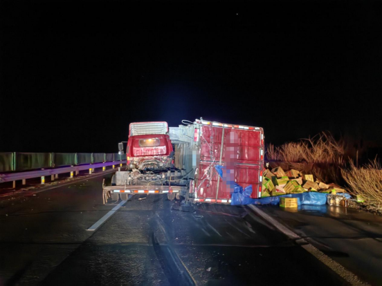 2023年3月12日22时许,山西省高速二支队六大队辖区孙右高速(大同方向)87km处发生一起两辆货车追尾的交通事故,占用第二行车道及应急车道。