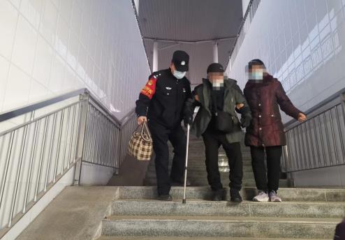子长站派出所教导员在站台巡逻时发现一名腿部残疾老人拄着拐杖被妻子搀扶。看到老人行动不便,子长所教导员立刻上前伸出援手,帮助老人提起行李,搀扶老人上下台阶,将老人送至车站广场。