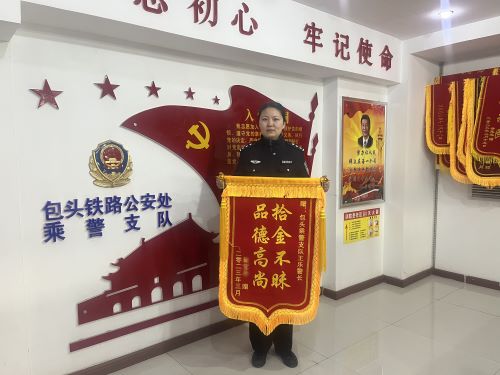 3月26日,旅客翟先生将一面锦旗赠予包头铁路公安处乘警支队民警,感谢民警帮助其妻子找回遗失的贵重物品。