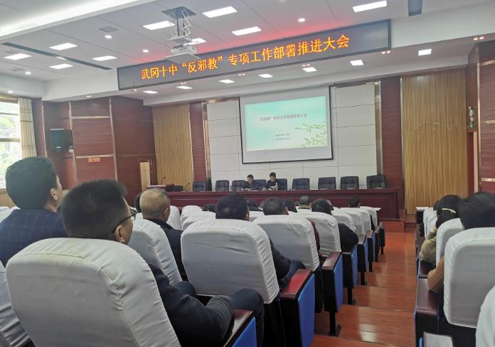 为扎实做好学校“反邪教”宣传教育和防范工作,不断筑牢校园安全工作防线,努力推进平安健康校园建设,4月26日下午,武冈十中在博闻楼学术报告厅隆重召开“反邪教”专项工作部署推进大会,学校领导、年级部负责人、政教处工作人员和全体班主任参加,政教副校长周科华主持会议。