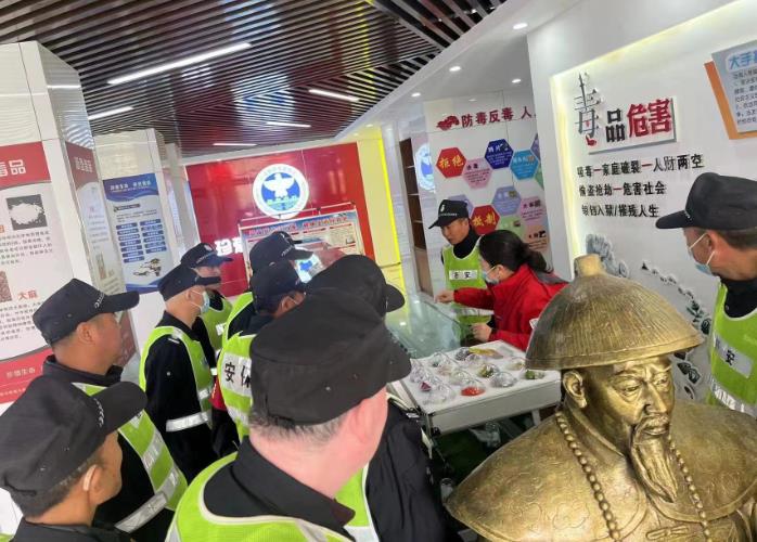 进入展厅后,讲解员为安保人员普及了毒品的知识——“毒品的起源”“什么是毒品”“毒品有哪些种类”“吸食毒品有哪些危害”等,还向安保人员展示了历代毒品样品的仿真模型,详细介绍了各种新型毒品(“依托咪酯”“蓝精灵”“开心水”“网红减肥药”“奶茶”“神仙水”“跳跳糖”等)的特点、危害,让大家辨清了毒品的多重面目,了解毒品相关知识。 民警结合本人从事基层禁毒工作实际经验,运用历年来群众身边发生的涉毒真实典型案例,以案说法,提醒大家构筑拒毒心理防线,警惕吸毒陷阱,引导大家积极树立正确的世界观、人生观、价值观, 其次校园安保人员天天与青少年接触,一定在日常工作中做好宣传的第一道防线,扛起禁毒工作的一份社会责任, 最后安保人员慷慨激昂的进行禁毒宣誓。