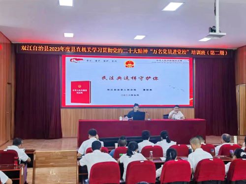 为深入学习宣传贯彻落实党的二十大精神,全面落实云南省2023年普法强基补短板专项行动,使广大党员干部牢固树立依法治国、执法为民、公平正义、服务大局的理念,带头尊法学法守法用法。近日,双江法院走进县委县直机关工委举办“万名党员进党校”第二期培训班,为县直各机关(事业)单位党组织、两新党组织240余名党员上了一堂《民法典这样守护你》的法治课。
