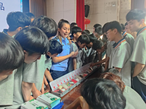 活动现场,禁毒大队民警通过发放宣传折页、展示毒品仿真模型,结合典型案例,现场以案说法的方式向同学们讲述毒品的种类、危害以及如何防范毒品侵害。通过互动启发式的宣传活动,从思想上、行为上深化禁毒理念,切实提高师生禁毒意识,增强抵制毒品侵蚀的能力,让识毒、防毒、拒毒意识入脑入心。