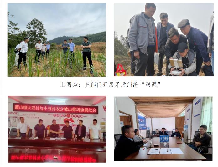 纠纷“联调”。解决省际接边地区发生的矛盾纠纷,重在及时调处、贵在协同配合。一是针对毗邻接边地区矛盾纠纷性质、成因和发展、变化的特点和规律,定期开展矛盾纠纷排查、建立台账、成立调处专班,实行领导包案、跟踪督办机制。二是充分发挥乡镇、村级法律顾问、村级法律明白人、学法用法示范户、村级人民调解员调解组织和双方有威望的老干部、寨老的作用,多渠道、多形式化解矛盾纠纷。目前,培育学法用法示范户234户,村(社区)法律顾问234人,覆盖全县所有村(社区),并同步建立村(社区)法律顾问微信群,实现线上线下全覆盖,成为基层群众的“随身法律顾问”,在处理山林权属纠纷时,充分提供法律服务和引导,促使纠纷得以圆满解决,尤其是一些长达几十年的历史遗留纠纷得以圆满化解。