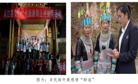 感情“联谊”。针对接边地区同为苗、侗、壮、瑶等少数民族聚居地,民族文化、生活习俗互通的特点,从江县通过整合民族文化资源,利用每年节庆活动,以“吃相思”、吹芦笙、民歌对唱、民歌普法、开展法治文艺演出进村寨、播放法治电影等多载体的形式开展交流活动,通过学法用法活动的深入开展,加强感情交流、增进友谊,同时引导边界地区树立运用法治思维和法治方式解决问题的鲜明导向,打造“办事依法、遇事找法、解决问题用法、化解矛盾靠法”的法治环境。