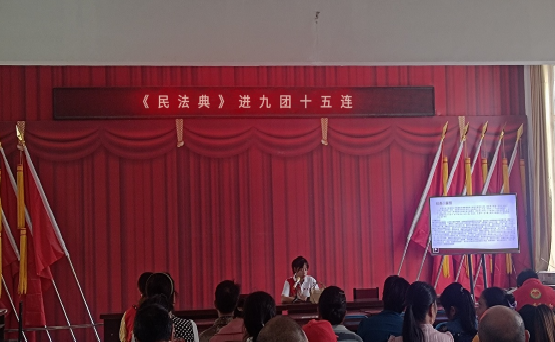 民法典进连队:法治团场的建设离不开广大职工群众的宣传与努力,本次民法典宣传月,九团司法所进十五连进行宣讲活动。西部计划志愿者对《中华人民共和国民法典》中婚姻家庭编进行重点讲述,提醒广大职工群众婚姻家庭受国家保护、夫妻间要和平沟通交流、妥善处理与使用夫妻共同财产等,为和谐九团的建设贡献了司法力量。