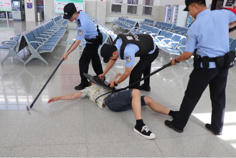 演练按照预设警情:一名男子携带行李进入候车室,行李通过安检仪时,被安检员发现行李内有疑似爆炸物,男子违法行为暴露后,从身上拿出刀斧进行砍杀,车站执勤民警迅速反应,以最小作战单元密切配合、协同作战最终将暴恐份子制服,有效地排除了警情。所领导指出演练中存在的问题与不足,并针对操练中的规范流程、动作要领、注意事项等进一步加以规范性指导。