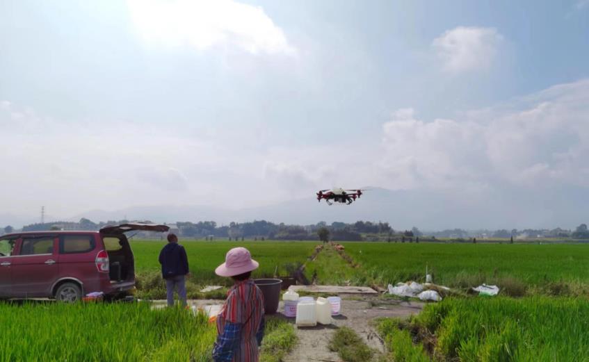 7月16日,武冈市浩宇农机专业合作社负责人毛震宇操作植保无人机给文坪镇黄泥坳村种粮大户毛来生的连片水稻施药。毛来生站在田边察看施药效果后,乐呵呵地笑了:“打药除虫,我终于可以当甩手掌柜。”