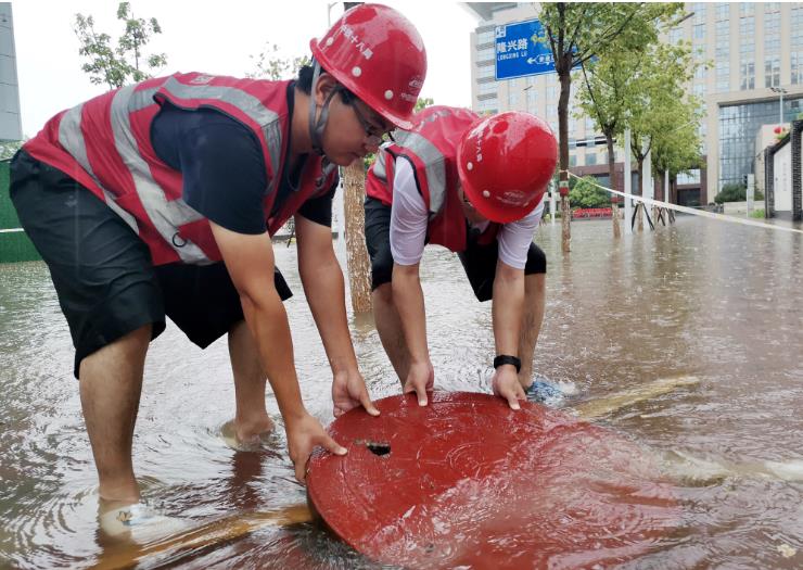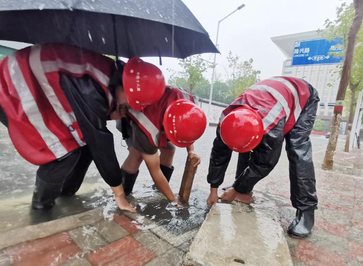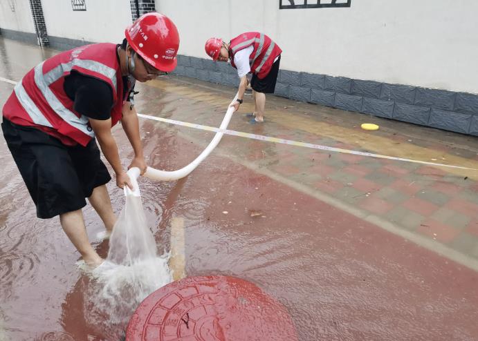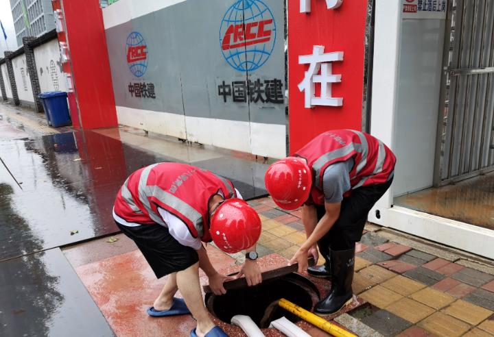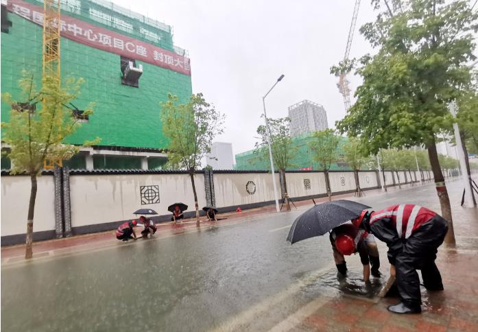 勠力同心,处置内涝。台风暴雨来临前,河北项目群对暴雨可能引发内涝高度警惕,提前备足相关应急抢险物资、设备,安排好应急队伍,对项目部周边道路排水系统根据“预防为主、防治结合”的方针,“勤排查、早发现、有预防、重处置”的原则,形成闭环管理。各项目部仔细检查,及时清除沟渠“血管”淤塞,打通排水“脉络”,确保项目部周边道路边沟排水流畅。暴雨期间,由于降水量过大,汇程国际项目部施工人员冒雨打开道路沿线下水口、雨水箅子,对堵塞排水系统的落叶断枝杂物、垃圾进行清理清掏,解决因暴雨水道口堵塞的难题,保障排水沟通畅。另外对项目部周边道路路面、人行道、交叉道口等因雨水冲刷而积存的泥沙、垃圾、树木断枝落叶等杂物及时进行清扫,全面清除路障,保障路面安全。