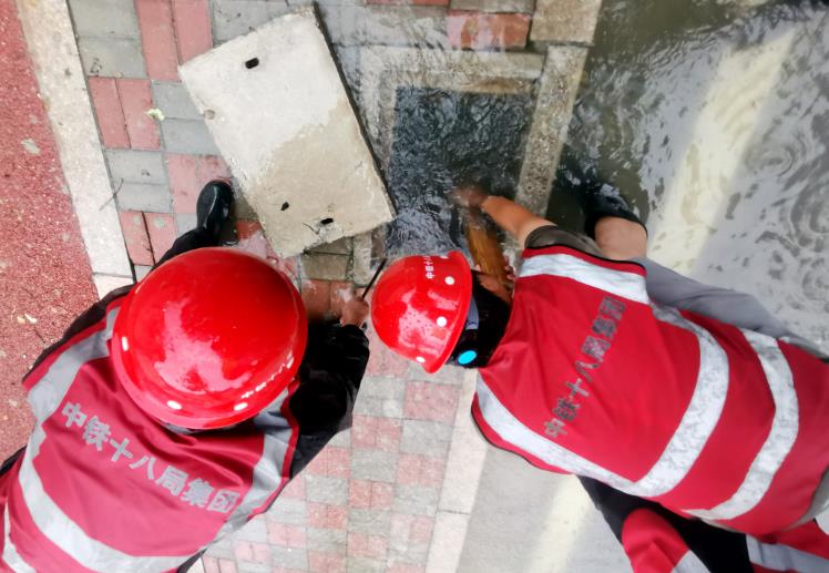 中铁十八局集团北京公司正定汇程国际项目抗台风防汛人员疏导周边道路排水系统(伍振 摄)