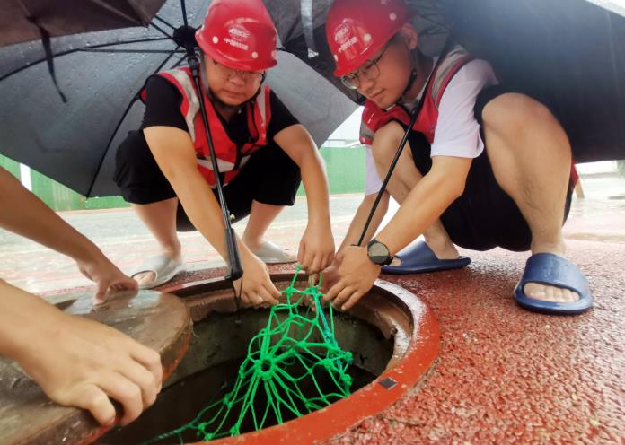 中铁十八局集团北京公司正定汇程国际项目抗台风防汛人员做好井盖防坠网安全检查(伍振 摄)