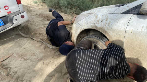 经了解,驾驶员吐某因开车车速过快,冲下路基陷入沙地导致无法脱离困境,在想拨打电话求助时才发现方圆十几公里手机都没有信号,无法向外界求助,在绝望的心情与烈日的炙烤下,车上仅存的两瓶矿泉水也被三人喝了个干净就在绝望之际,看到了有警车朝这里驶来。说话间,驾驶员吐某握着民警的手流下了激动的泪水。