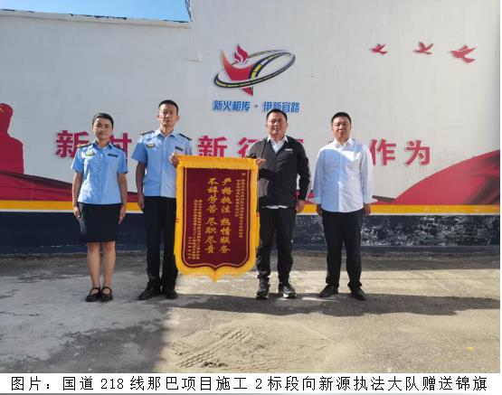 近日,国道218线那巴项目施工2标段、4标段分别向新源执法大队赠送了“严格执法 热情服务 不辞劳苦 尽职尽责”“忠于职守 服务为民”的烫金字样锦旗,以感谢新源执法大队对那巴项目涉路施工安全的悉心指导和监管。