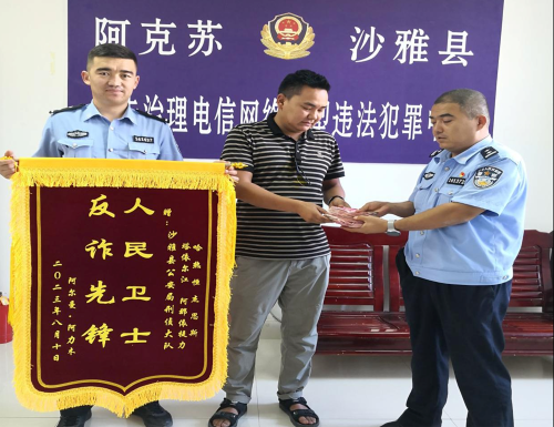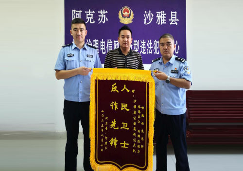 “太感谢你们了,帮我追回损失,给你们点赞”,8月10日,沙雅县沙雅镇居民阿某将一面印有“人民卫士,反诈先锋”的锦旗送到了沙雅县公安局刑事侦查大队办案民警的手中,感谢民警迅速破案,为其追回被骗的3万元钱。