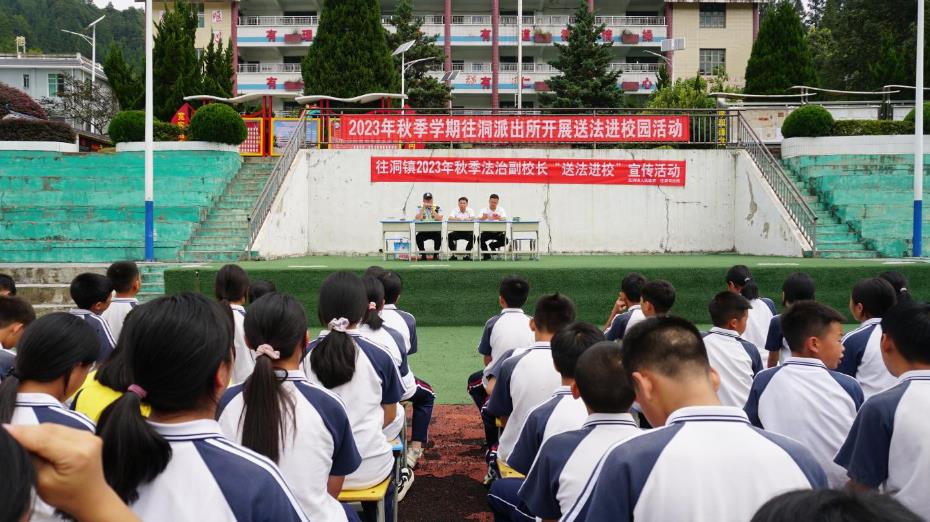 为深入贯彻习近平法治思想,进一步增强青少年学生的法治思维、法治观念、法治意识,切实做好未成年人保护、犯罪预防和法治教育普及工作。2023年9月6日,往洞司法所、派出所利用秋季开学之际到往洞中学开展法治副校长“送法进校”宣传活动。