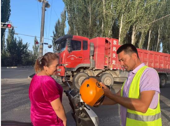 “你好,请注意交通信号灯,目前车流量较大,乱穿马路很危险。”“骑电动车上路一定要戴头盔,要对自己的安全负责。”在库车市墩阔坦镇英吐尔村道路旁,身穿反光背心的交通劝导员,正在通过手势指引、语言劝导等方式,提醒大家遵守交通规则。