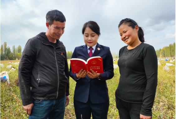 工作队员阿斯叶·买买提明在田间地头讲解《民法典》知识