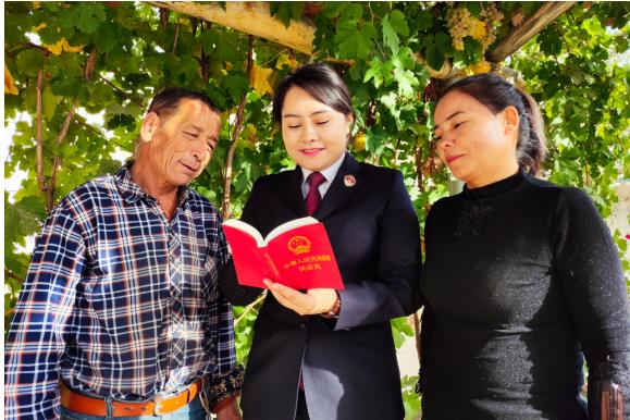 工作队员阿斯叶·买买提明在葡萄树下讲解《民法典》知识