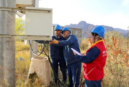 图为:2023年10月16日, 国网乌什县供电公司天山雪莲党员服务队队员在乌什乌什县奥特贝希乡巴什阿克玛村沙棘种植基地检查排灌供电设备安全隐患。外力·克依木 摄