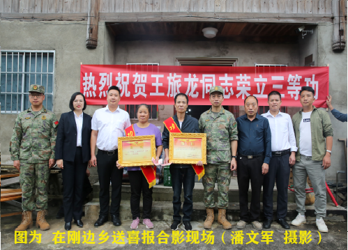 10月19日,从江县人武部、县退役军人事务局联合贵州从江农村商业银行股份有限公司、从江县非公有制经济组织拥军协会、从江县宰便镇商会,先后到刚边乡、宰便镇引东村,为荣立三等功的两名现役军人家庭送去立功喜报,向他们表示祝贺并送上奖励金。