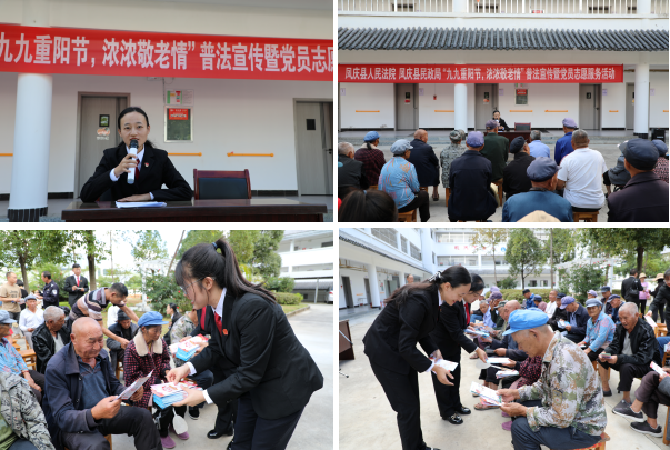 夕阳无限好,人间重晚晴。为大力弘扬中华民族敬老爱老的传统美德,切实维护老年人群体的合法权益,近日,凤庆县人民法院到敬老院、农贸市场、公园等地开展了重阳节系列活动,同时召开了退休干警座谈会,共迎佳节,共谋发展。