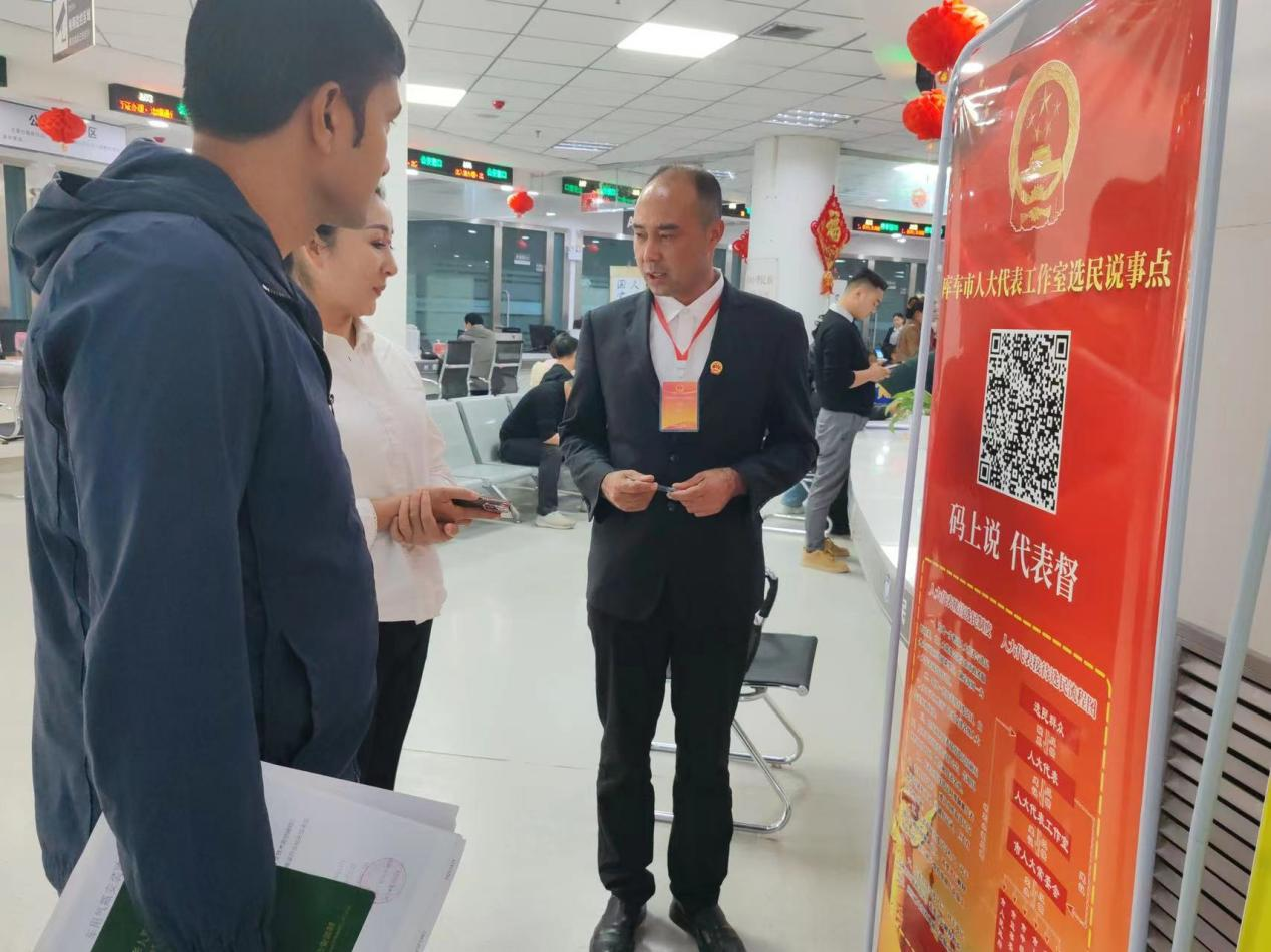 10月23日一早,在新疆库车市政务服务大厅选民说事点接待选民的库车市人大代表艾尼瓦尔·牙生,迎来了他的第一位选民群众。他一边侧耳倾听“民声”,一边将“民意”记录在接待手册上,在为群众提供完咨询引导、政策解读服务后,不忘向大家介绍“码上说 代表督”小程序,宣传每周一开展的选民接待日活动。