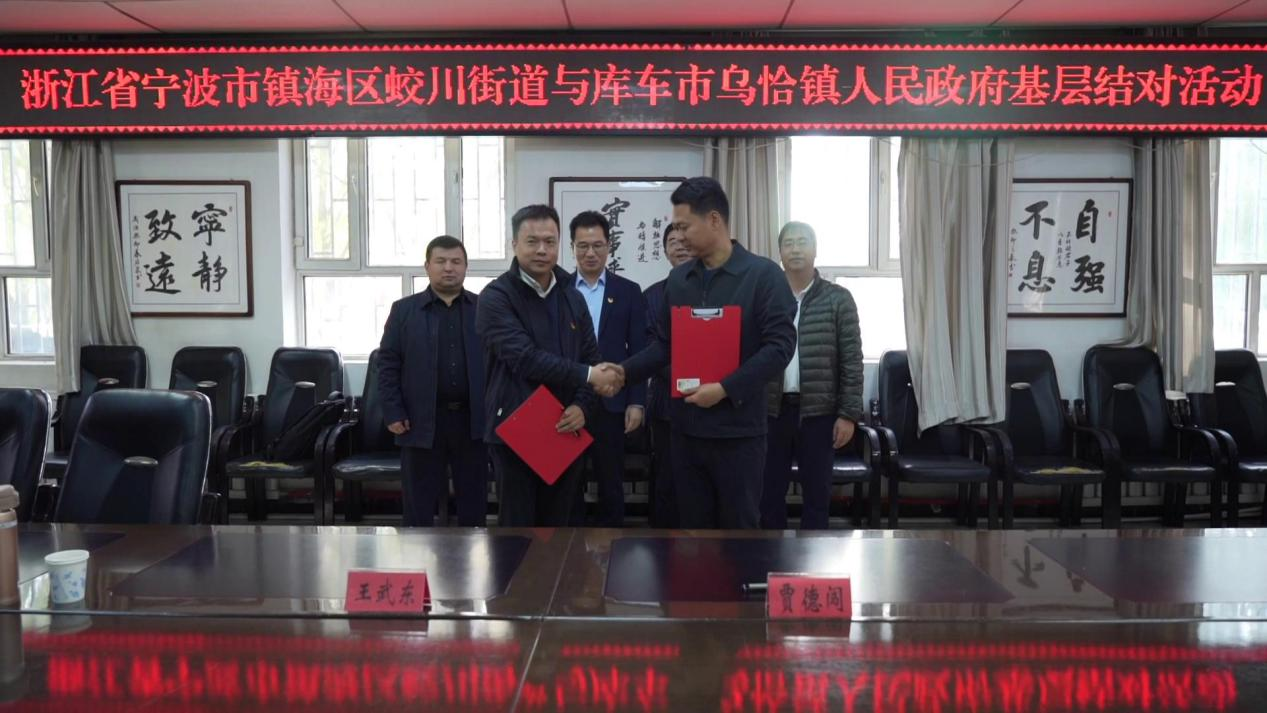 为认真贯彻落实第三次中央新疆工作座谈会、第九次全国对口支援新疆工作会议精神,进一步推进新时代宁波市对口支援库车工作,根据浙江省和宁波市对口援疆工作要求,11月14日,在宁波市援疆指挥部的统筹安排下,宁波市镇海区澥浦镇、蛟川街道分别与新疆库车市玉奇吾斯塘乡、乌恰镇举行基层结对仪式,进一步深化甬库两地交往交流交融。