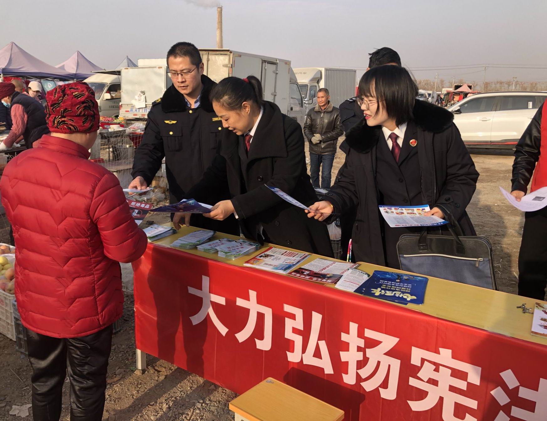 12月3日上午,一师阿拉尔市市场监管综合行政执法支队联合阿拉尔市金银川镇公检法机关和社区工作人员2023年“12•4”国家宪法日集中宣传活动,现场向职工群众发放《食品安全法》、《食品安全法实施条例》等法律法规资料,宣传市场监管领域法律法规及部门职责,同时接受市民群众法律咨询,解答市民群众关心的市场监管领域热点难点问题。