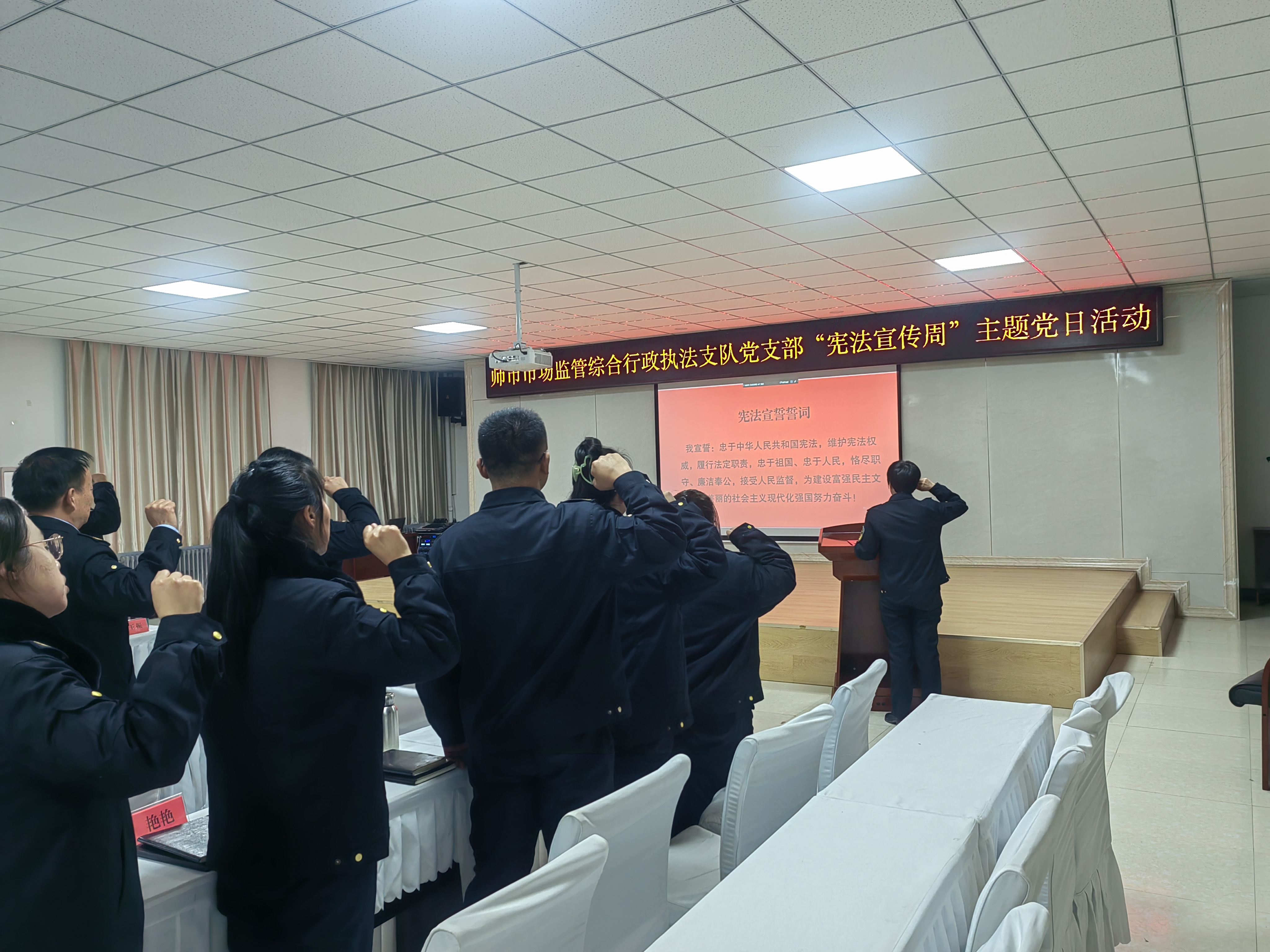 今年12月4日是第十个国家宪法日,一师阿拉尔市市场监管综合行政执法支队通过集中参加宪法日广场活动、集中开展多媒体宣传、集中组织宪法学习、集中举行宪法宣誓等多种形式进行宪法宣传,大力弘扬宪法精神,营造法治宣传氛围,提升干部职工法治意识,积极为一师阿拉尔市法治政府建设贡献力量。