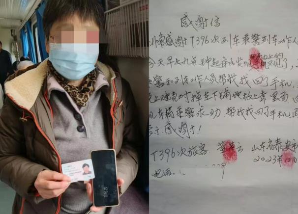 接到警情求助后乘警立即到达14号车厢开展工作,帮忙查找并询问周围旅客捡到或者看到有无人认领的手机没有,未果。乘警经过努力查找最终在其铺位下铺地上靠近里面墙的位置找到其手机,如果不蹲下打着手电观看查找,真的不容易被发现。黄大妈为了表示感谢乘警的帮忙并当场写下感谢信一封。