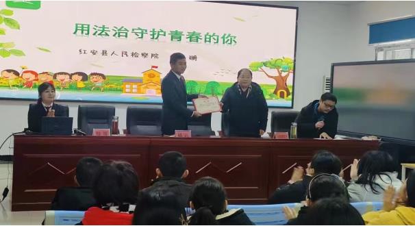 1月4日上午,大赵家高级中学举行法治副校长聘任仪式暨法治教育专题讲座。红安县人民检察院党组成员、司行局局长杨光同志被聘任为学校法治副校长,检察官钱珊同志为全体高一师生作法制讲座。