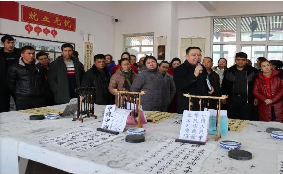 图为:1月8日,新疆阿克苏地区温宿县技工学校举行了‘家长开放日’活动,校领导对在学校学习国家通用语言文字期间表现优异的学生进行表彰奖励并致以热烈的祝贺(江凯摄)