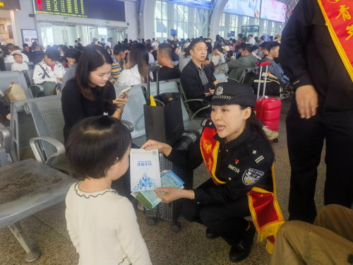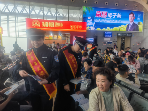 为守护旅客出行的安全,海口东所组织警力对旅客开展防电信诈骗、防盗、禁毒等法制知识宣传,提升旅客的自我保护意识和安全防范常识,保障旅客的平安出行。(通讯员:陈泽)
