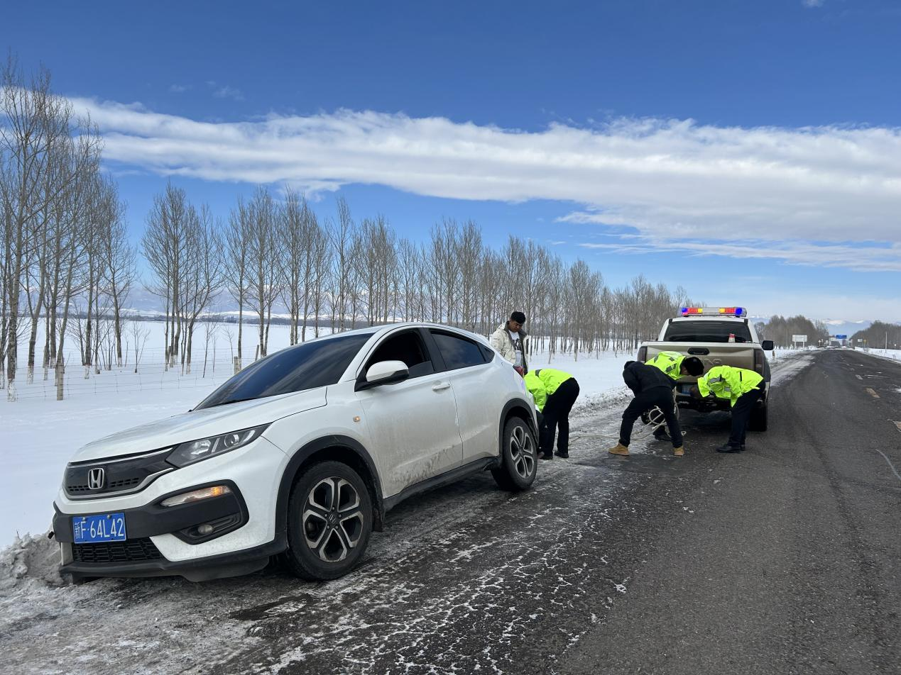 2月19日18时许,昭苏执法大队执法人员正在进行日常巡查,当巡查至G577线K320+440公路右侧时,发现一辆白色小轿车半个车身误入路基下的雪窝里。执法人员立刻停车上前询问情况,车主说驾车行驶到这里时由于行驶速度过快刹不住车,不慎开入路基下的雪窝里。由于车上没有牵引绳,加上雪地胎磨损防滑功能减弱,车辆无法开出雪窝,需要执法人员帮助。一名执法人员见状立刻维护现场交通秩序,其余两名执法人员摆好安全锥,趴在地上检查车辆状况,确定车辆无故障后从执法车中拿出牵引绳,对车辆进行拖拽,经过10分钟的努力,大家齐心协力将受困车辆拖至安全地带。随后执法人员向车主宣传了道路安全基本常识,并再三叮嘱车主减速慢行,建议尽快更换雪地胎,避免造成更加严重的后果,车主对执法人员认真负责的工作态度连连称赞并表示感谢。