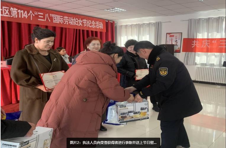 二是送“三八”祝福,表彰暖人心。执法人员在活动现场向“好婆婆”“好媳妇”“最美家庭”荣誉获得者进行了表彰并送上节日祝福和慰问品,号召广大妇女群众在新时代争做先进,弘扬家庭美德,涵养质朴家风,充分发扬“自尊、自爱、自立、自强”的精神风貌。