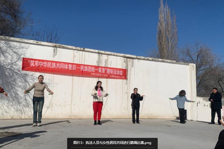 三是开展“铸牢中华民族共同体意识,民族团结一家亲”趣味运动会。运动会在欢乐的气氛中进行,执法人员与辖区妇女群众共同进行跳绳比赛,展示新时代女性风采,营造了浓厚节日氛围。一项项趣味十足的运动项目让辖区各族群众体会到了运动的快乐,也展现了各族群众热情昂扬的精神面貌和健康快乐的生活态度,促进了民族团结一家亲活动的深入开展,为进一步维护民族团结和社会稳定打好坚实的基础。