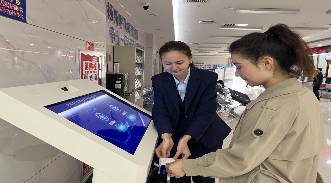 图为:温宿县社保中心综柜窗口工作人员帮办事群众取号(江凯摄)