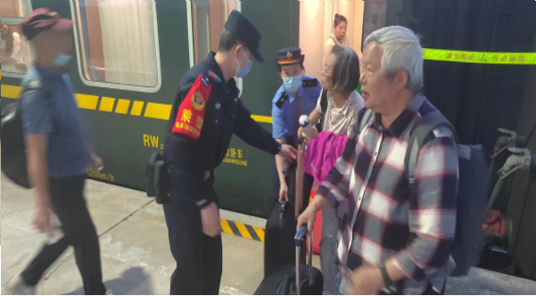 面对有下车需求的旅客,乘警及时维持下车秩序,做好旅客疏导,对行动不便的旅客进行帮扶,期间,乘警周建成看到两位老人拿着多件大行李,行动不便,周建成立即上前询问两位老人行李是否带全,并接过行李,将他们搀扶下车。“轮椅太沉了,您交给我!”在张嘉轩值乘的列车上,一名旅客拿着轮椅,不方便下车,张嘉轩一边帮助旅客将轮椅搬运下车,一边提醒其他旅客携带好个人的行李物品。