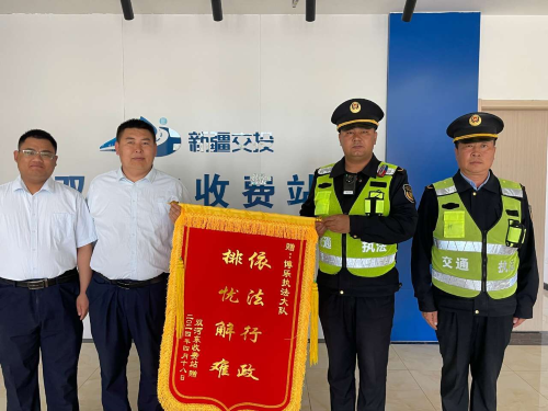 近日,新疆交投精阿高速运营管理有限公司双河东收费站负责人将一面印有“依法行政 排忧解难”的锦旗和一封感谢信送至博乐执法大队执法人员手中,对博乐执法大队驻站期间的公正执法、热情服务表示真挚的感谢。