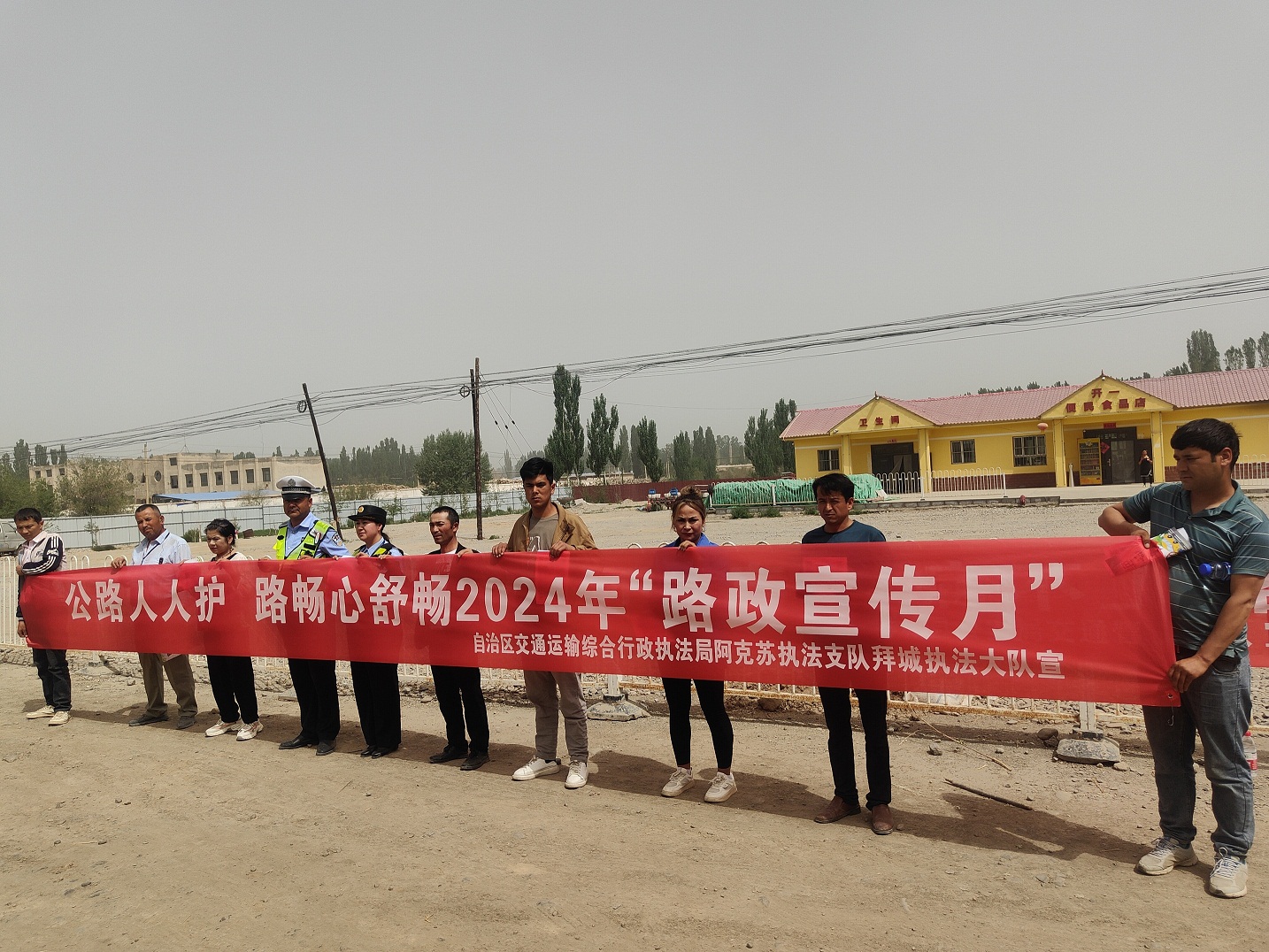 5月8日至10日期间,拜城执法大队组织执法人员,联合公安交警部门前往辖区S307线各公安交警检查点,对辖区群众、驾驶员宣传《中华人民共和国公路法》、《中华人民共和国公路安全保护条例》、《新疆维吾尔自治区货物运输车辆超限超载治理办法》等法律法规和道路交通安全知识;同时,现场解答驾驶员关于交通运输执法相关疑点问题,使得活动取得实实在在的宣传效果。活动期间,共投入宣传人员6人次,制作宣传横幅1条,发放宣传资料230余份,现场解答群众疑点问题12人次。