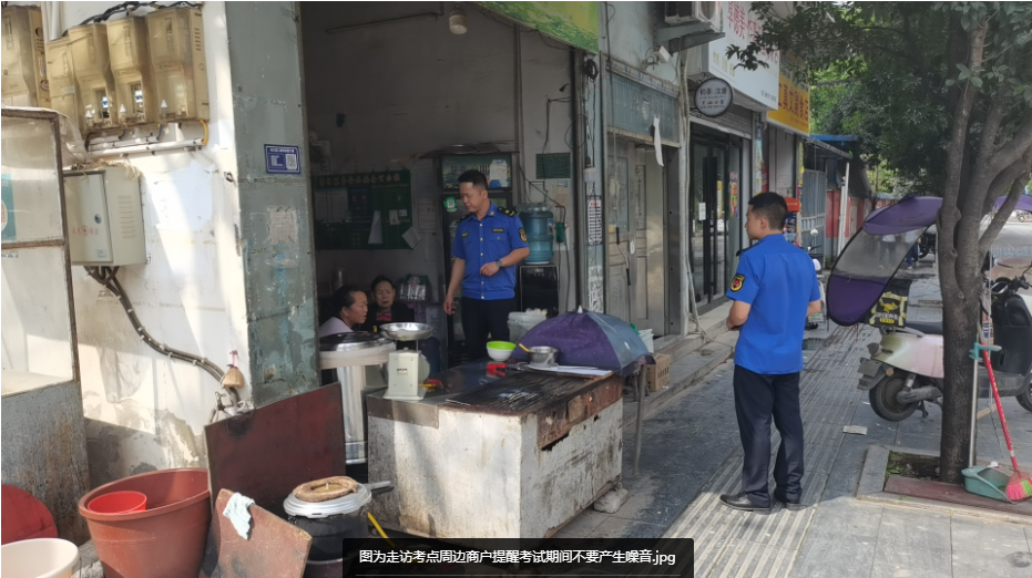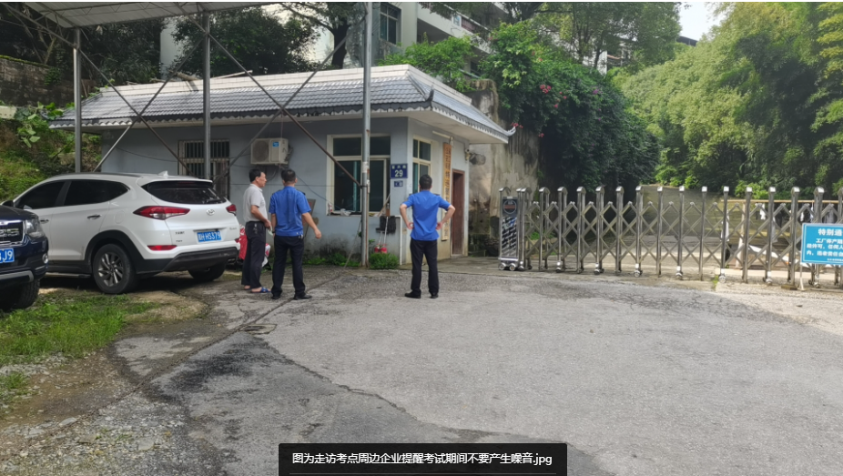 开展考前走访。对考点周边住户、商场商铺、建设工地、餐饮单位等进行走访宣传,发放温馨提示资料,要求在考试期间禁止产生噪音,共同开启“静音模式”。共走访周边住户、商超、餐饮单位、建设工地79家,发放温馨提示资料79份。