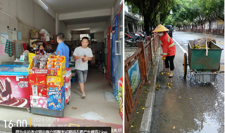 开展环卫保洁。对考点周边环境进行巡回作业,全面消除考点周边卫生死角和保洁盲区,确保无垃圾污物,环境干净整洁,全力做好考点周边环境卫生保障工作。( 通讯员: 石一清)