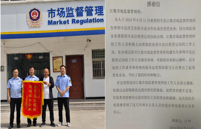 位于利辛县江集镇的某农机专业合作社是第一个通过“延伸服务窗口”解决发展难题的企业,6月11日,该合作社负责人通过“延伸服务窗口”向工作人员倾诉了苦恼,原来该合作社成立时间较早,为了激发活力,合作社负责人想吸纳新成员,但是原有的成员认为此事有风险,不愿意配合,因此变更的事情一直耽搁着。经过窗口分析研判,认为这是一起由于合作社成员不了解政策法规、不接受新兴事物而产生的抵触现象,接单后该局登记注册部门联合江集市场所组成了“延伸服务窗口”小分队,驱车到合作社成员家中向他们详细宣传《中华人民共和国农民专业合作社法》并解释了合作社成员调整是正常现象,有利于合作社更好地运营,给大家增收创收。有了执法人员的专业讲解和耐心疏导,合作社成员终于达成了一致意见,同意了此次变更,后续“延伸服务窗口”人员还现场办公,为该社提供了变更代办服务,当天该合作社就完成了变更登记。为表达感谢,该合作社负责人还给“延伸服务窗口”送去了一面锦旗和一封感谢信。