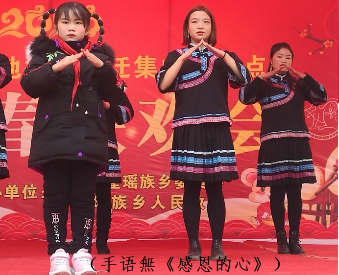 联欢会在16位瑶族大姐充满活力的“竹竿舞”中拉开序幕。随后,手语舞《感恩的心》、诗朗诵《天路瑶歌》等瑶汉同胞自编、自导、自演的精彩节目轮番上演,赢得了在场群众阵阵喝彩。