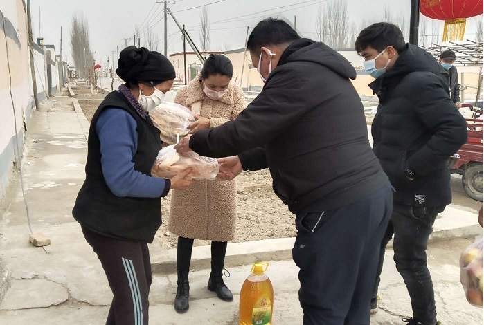 困难群众海尔尼沙.买提米西激动地说道:“这段时间我家里人又多,5个外孙及3个孙子都在我家里,米、面、油、菜没几天就没有了,不能外出,生活物资紧缺,感谢党和政府,谢谢工作队为我们送来了生活用品,解决了我家的困难”。